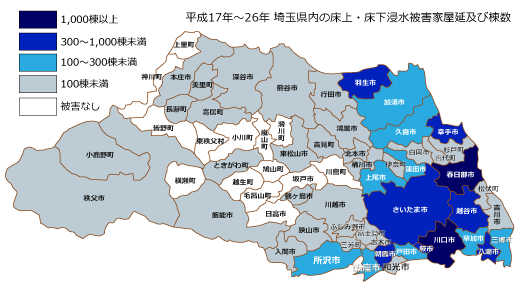 また平成17年~26年の間に埼玉県内で発生した水害の被害家屋延及び棟数を見ると、