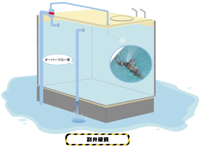 副弁が劣化や腐食により破損した結果、止水制御が効かず溢水事故(オーバーフロー)へ発展。
